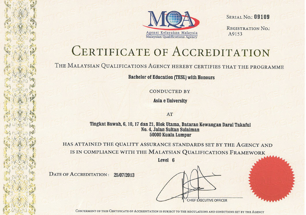 Asia e University is on an ongoing process to get approval and accreditation for all academic programmes from Malaysian Qualifications Agency (MQA). Click on the links below to view the accreditation obtained by programme.